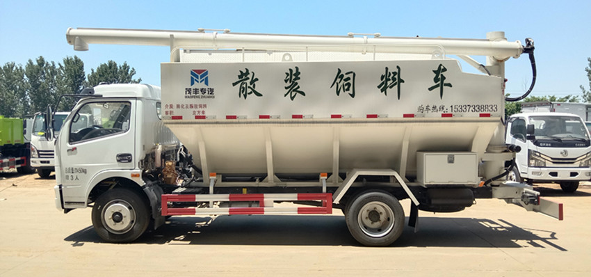 散装饲料运输车,散装饲料车的饲料罐架设在卡车的底盘上,罐顶开有进料口.顶部的一根螺旋输送卸料管(俗称卸料绞龙)则可自由回转和抬升,抬升的仰角可达60度。运输时,顶部的螺旋管平卧在罐顶;卸料时则抬起,使管端的出料口与畜禽饲养场贮料罐顶部的进料门相接,驾驶室内装有操纵装置(操纵装置也可装置在罐体尾部),卸料时通过车底的动力输出轴和减速器来驱动螺旋,以完成卸料。