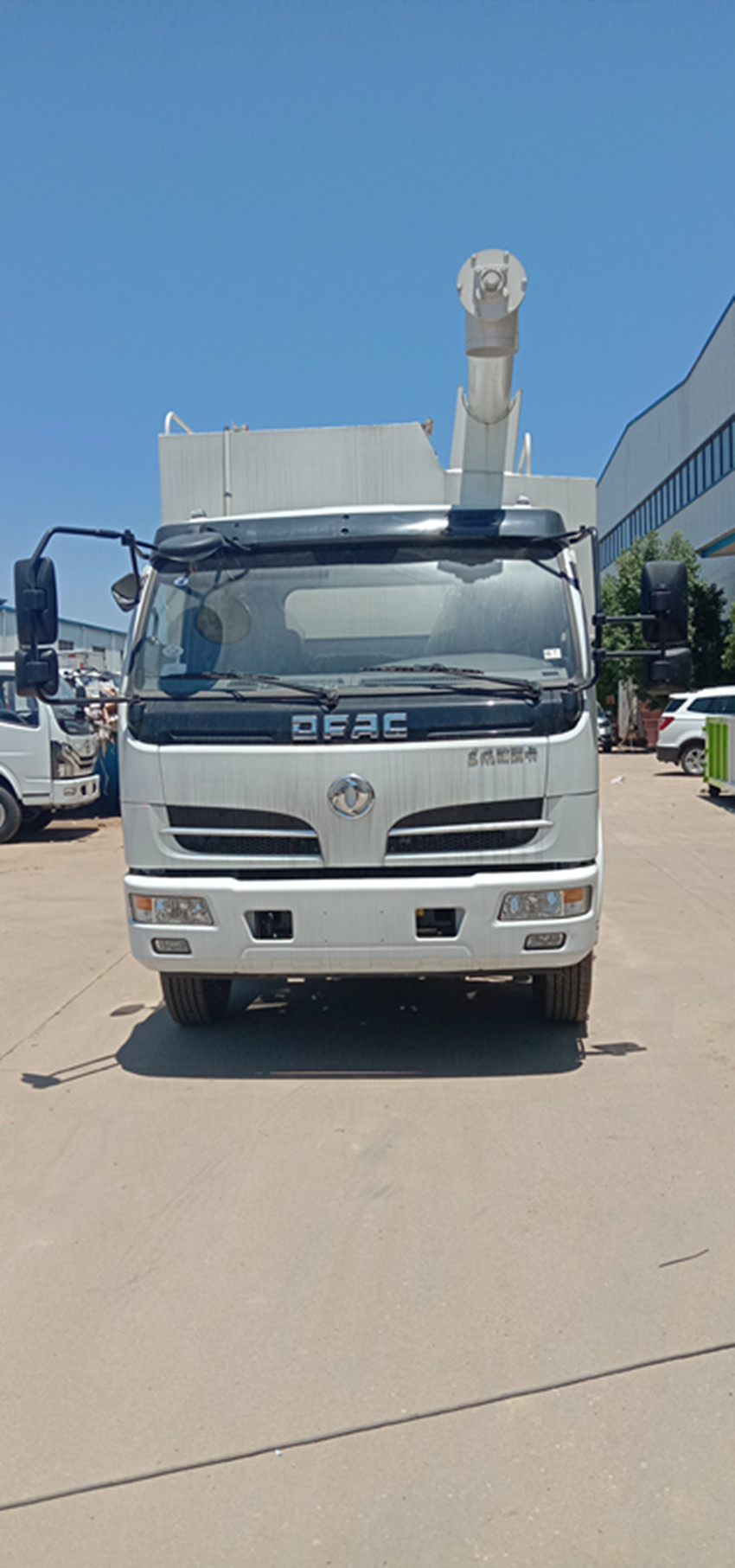 散装饲料运输车,散装饲料车的饲料罐架设在卡车的底盘上,罐顶开有进料口.顶部的一根螺旋输送卸料管(俗称卸料绞龙)则可自由回转和抬升,抬升的仰角可达60度。运输时,顶部的螺旋管平卧在罐顶;卸料时则抬起,使管端的出料口与畜禽饲养场贮料罐顶部的进料门相接,驾驶室内装有操纵装置(操纵装置也可装置在罐体尾部),卸料时通过车底的动力输出轴和减速器来驱动螺旋,以完成卸料。