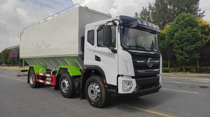 散装饲料运输车,散装饲料车的饲料罐架设在卡车的底盘上,罐顶开有进料口.顶部的一根螺旋输送卸料管(俗称卸料绞龙)则可自由回转和抬升,抬升的仰角可达60度。运输时,顶部的螺旋管平卧在罐顶;卸料时则抬起,使管端的出料口与畜禽饲养场贮料罐顶部的进料门相接,驾驶室内装有操纵装置(操纵装置也可装置在罐体尾部),卸料时通过车底的动力输出轴和减速器来驱动螺旋,以完成卸料。